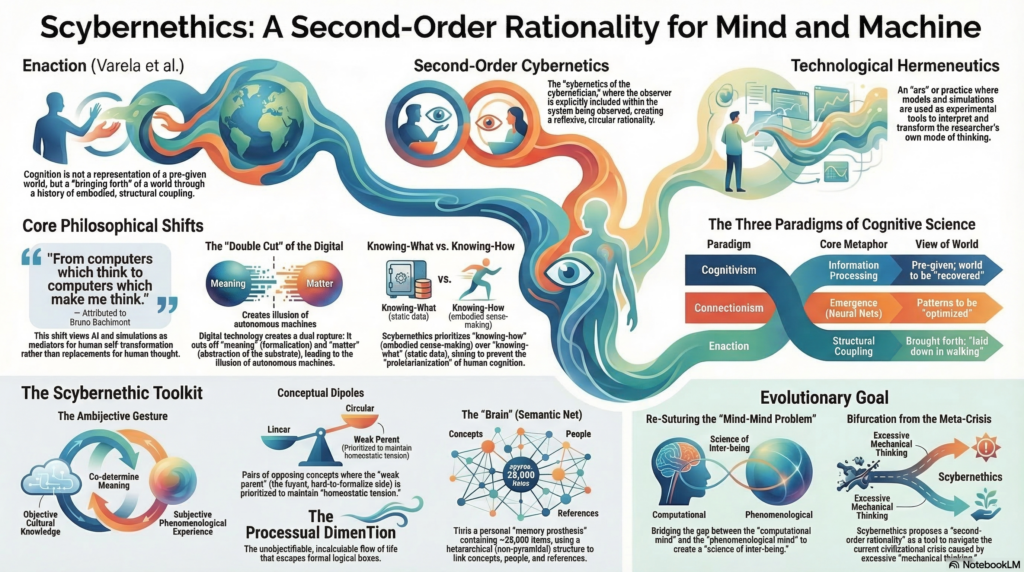 It can be understood as a comprehensive and creative enactive rationality (Varela, Thompson) rooted in lived experience, body sense-making and participatory scientific knowledge (Di Paolo, De Jaehger). It put into circulation theory, practice, cultural, experiential and even existential dimensions. Scybernethic(s) is also an aesthetic of self (Foucault, Alva Noë).